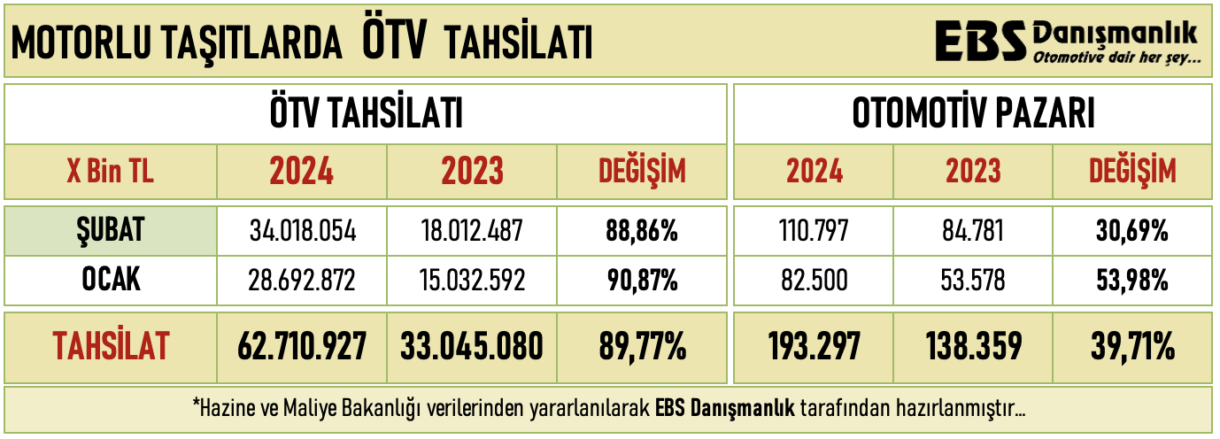 Aslında ÖTV muafiyetli otomobil satışına rağmen hem ocak hem de şubat ayında otomotivden tahsil edilen ÖTV geliri toplam pazardan daha fazla arttı. Düşünün ocakta otomotiv pazarı yüzde 53,98 büyürken, devletin ÖTV tahsilatı yüzde 90,87 artarak 28,7 milyar TL’ye ulaştı. Yine aynı şekide şubatta toplam pazar yüzde 30,69 büyürken, ÖTV tahsilatı yüzde 88,9 artarak 34 milyar TL’yi aştı. Sonuç olarak ilk 2 ayda satışların üçte biri ÖTV'siz engelliler için araç satışı olmasına rağmen tahsilat yüzde 89,8 artışla 62,7 milyar TL’nin üstüne çıktı.