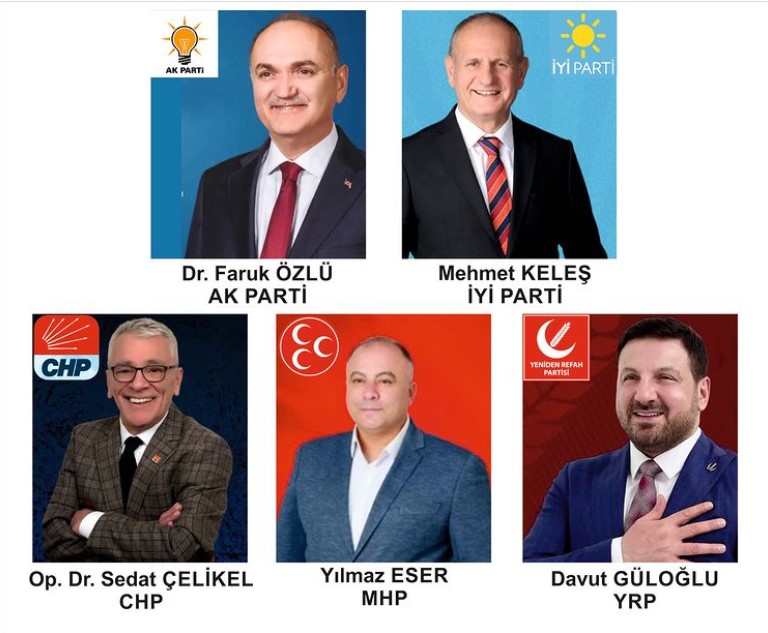 Seçimlerde, MHP’den Yılmaz Eser, CHP’den Sedat Çelikel, DEVA’dan Murat Caymaz da yarışta. İlde Başkan Faruk Özlü’nün değişmesi beklenmiyor ama herkes partisinin oyunu artırmanın peşinde.