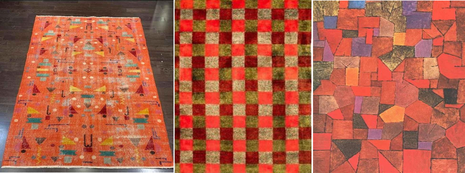 Zeki Müren tasarımları üstünde tek tek durmayacağım, sayfada kimi tasarımları esin almış olabilecekleri resimlerle bir araya getirdim, okuyucular başka benzerlikler de keşfedebilirler. Ama dikkat çeken bir noktayı da aktarmadan geçmeyelim; “Sabır Taşı” adlı tasarımı gibi "psychedelic" bir estetiğe sahip olanlar da dahil, kimi çağdaş sanatçıların tasarladıkları halı ve kilimlerin tersine, simetrik ve yineleyen örüntülerden oluşuyor bu tasarımlar; Zeki Müren bu konuda geleneğe bağlı kalmış gibi görünüyor.