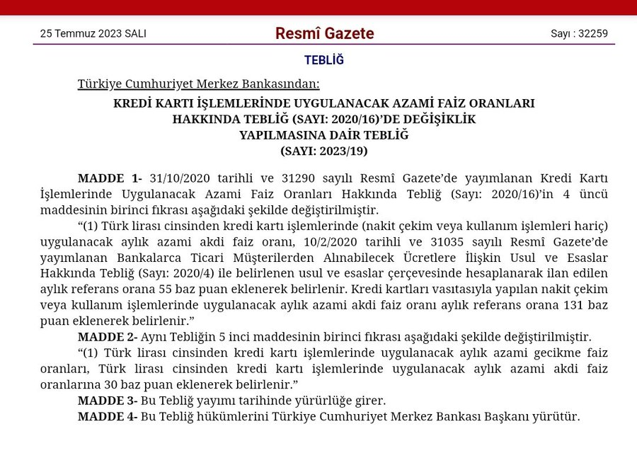 Kredi kartı nakit çekim azami faiz oranlarında değişiklik Resmi Gazete'de yayımlandı.