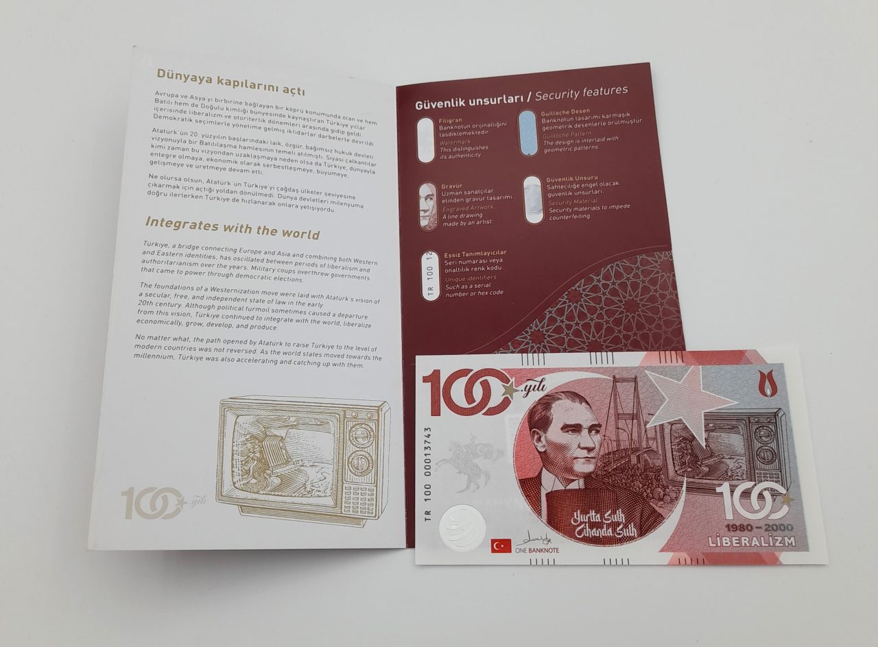 Türkiye Cumhuriyeti'nin 100. yıl kutlamaları, benzersiz bir “hatıra” ile taçlanıyor. İlhamını Türkiye’nin kuruluş mirası ve asırlık başarı serüveninden alan bir hatıra banknot koleksiyonu hazırlandı. Koleksiyonun içeriğindeki banknotlar, Türk ulusunun cumhuriyetle geçen 100 yıllık yükseliş hikayesini, “cumhuriyet”, “demokrasi”, “liberalizm” ve “ilerleme” şeklinde başlıklandırılan dört ayrı dönemde ele alarak görselleştiriyor. 100 yıllık Cumhuriyet tarihinin dönüm noktalarını sanatsal ifadelerle bir araya gertiren bu özel banknotlar, asırlık mirasa duyulan gururun gelecek nesillere taşınmasına vesile olacak. Koleksiyon, ayrıca, Cumhuriyet’in 100. yılına özel, özgün ve prestijli bir hediye arayanlar için mükemmel bir seçenek niteliğinde.