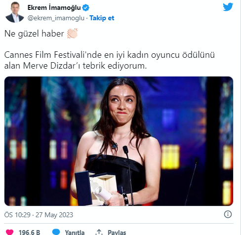 İmamoğlu, 76. Cannes Film Festivali’nde En İyi Kadın Oyuncu Ödülü'nü kazanan Merve Dizdar'ı sosyal medya hesabından tebrik etti.
