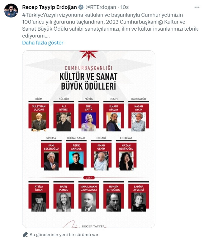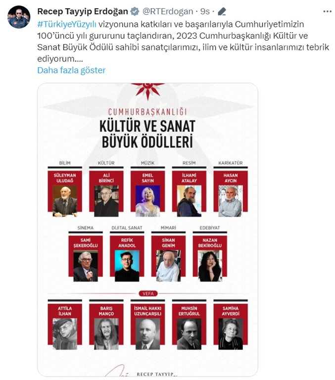 Erdoğan, sosyal medya hesabından yaptığı paylaşımda “2023 Cumhurbaşkanlığı Kültür ve Sanat Büyük Ödülleri”ni kazananları açıkladı.