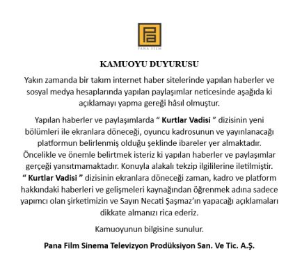 Pana Film, Kurtlar Vadisi'nin dijital bir platformda yakın zamanda yeniden başlayacağı haberlerine ilişkin bir açıklama yaptı. Açıklamada, çıkan haberlerin gerçeği yansıtmadığı belirtirken bu konuda bir tek Pana Film ve Necati Şaşmaz'dan gelen beyanların dikkate alınması gerektiği vurgulandı.