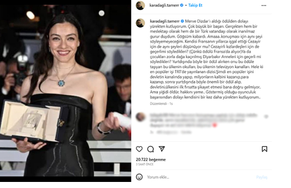 Tamer Karadağlı, Cannes Film Festivali'nde En İyi Kadın Oyuncu Ödülü'nü alan Merve Dizdar'ı önce tebrik etti, sonra eleştirdi