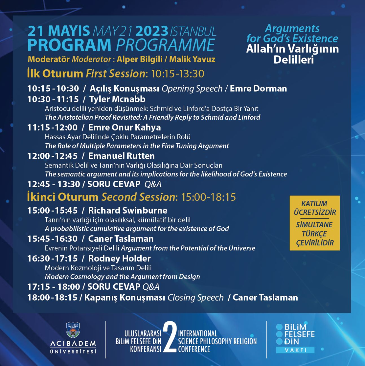 Bilim Felsefe Din Vakfı tarafından 21 Mayıs 2023 ve 4 Haziran 2023 tarihlerinde Acıbadem Üniversitesi'nde yapılacak olan iki ayrı konferansta, dünya genelinde tanınırlığı olan akademisyenler tarafından “Allah’ın Varlığının Delilleri” konusunda konuşmalar yapılacak. Konferans, simultane çeviri ile desteklenecek.