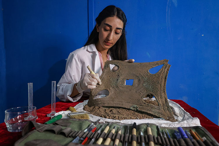 Urartular tarafından Van Gölü'ne hakim tepeye yaptırılan Ayanis Kalesi'nde yürütülen kazı çalışmalarında ortaya çıkarılan odada, kraliyet ailesinin duvarda süs olarak kullandığı değerlendirilen bronz mimari kaplama levhası bütün halde bulundu. Van'ın Tuşba ilçesinde yaklaşık 2 bin 700 yıl önceden bugüne ulaşan süslemeleri, kerpiç duvarları, taş işlemeleriyle Urartu Krallığı'nın en görkemli yapılarından biri olan kalede, 34 yıldır kazı ve restorasyon çalışmaları yürütülüyor. Atatürk Üniversitesi Arkeoloji Bölümü Öğretim Üyesi Prof. Dr. Mehmet Işıklı başkanlığında kalenin kuzey yamacında yapılan kazılarda, birbiriyle bağlantılı 4 yeni oda ortaya çıkarıldı. Yeni yapılarda sürdürülen kazı çalışmalarında, Urartularda kraliyet ailesinin duvar ve kapılarda süs olarak kullandığı, bronzdan yapılan üzeri bezemeli kaplama levhasına rastlandı. Bütün olarak ortaya çıkarılan eser, arkeologlarca laboratuvar ortamında analiz edilecek.
