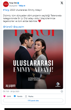 Yargı dizisinin Instagram hesabından yapılan teşekkür paylaşımında ise "Dizimiz, tüm dünyadan dört projenin seçildiği Telenovela kategorisinde En İyi Dizi adayı oldu! İzleyicilerimize teşekkürler ve tüm ekibe tebrikler" ifadelerine yer verildi.