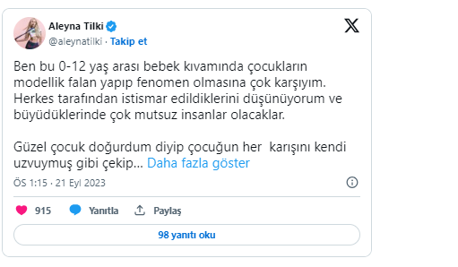 "Ben bu 0-12 yaş arası bebek kıvamında çocukların modellik falan yapıp fenomen olmasına çok karşıyım. Herkes tarafından istismar edildiklerini düşünüyorum ve büyüdüklerinde çok mutsuz insanlar olacaklar. 'Güzel çocuk doğurdum' deyip çocuğun her karışını kendi uzvuymuş gibi çekip paylaşan bir de üstüne onun adına post atan ebeveynler yargılansın. Tacizcilerden farkları olmadığını düşünüyorum."