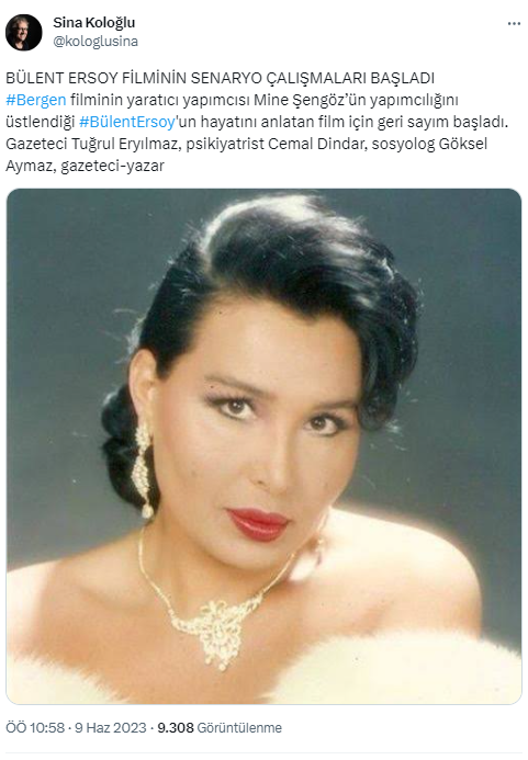 Gazeteci Sina Koloğlu, Bülent Ersoy'un hayatını anlatan bir film çekileceğini duyurdu. Koloğlu, sosyal medya hesabından yaptığı paylaşımda muhtemel filmin 2024 yılının sonuna doğru tamamlanacağını söyledi.