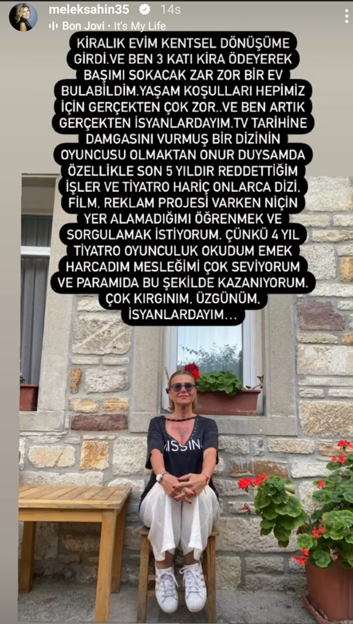 “Kiralık evim kentsel dönüşüme girdi ve ben 3 katı kira ödeyerek başımı sokacak zar zor bir ev bulabildim. Yaşam koşulları hepimiz için gerçekten çok zor ve artık gerçekten isyanlardayım… TV tarihinde damgasını vurmuş bir dizi oyuncusu olmaktan onur duysam da özellikle son 5 yıldır reddettiğim işler ve tiyatro hariç onlarca dizi film reklam projesi varken niçin yer alamadığım yer alamadığımı öğrenmek ve sorgulamak istiyorum. Çünkü 4 yıl tiyatro oyunculuk okudum. Emek harcadım Mesleğimi çok seviyorum ve paramı da bu şekilde kazanıyorum Çok kırgınım üzgünüm. İsyanlardayım…”