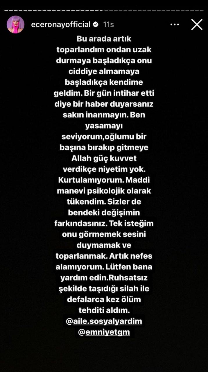 Ronay sosyal medya hesabından yaptığı paylaşımında, "1 ay öncesinde uzaklaştırma kararı almama rağmen 1 kere fiziki şiddete, bir kere de bulunduğum mekanı erkeklerle basmak suretiyle psikolojik şiddete maruz bıraktı" ifadelerini kullandı. Ronay paylaşımının sonunda "Artık nefes alamıyorum. Lütfen bana yardım edin. Ruhsatsız şekilde taşıdığı silah ile defalarca kez ölüm tehdidi aldım" cümlelerine yer verdi.