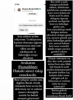 "Seni adalete teslim ediyorum. Uzaklaştırma kararın olmasına rağmen durmuyorsun ama seni elbet savcılık yakalayacak ve hak ettiğin cezayı alacaksın. Beni sahipsiz sandın ama değilim Burak Efendi... Arkamda beni seven bir sürü insan var ve onların manevi desteğiyle bu hukuk savaşına giriyorum. Ben artık 6 aydır yaptığın psikolojik şiddete, küfürlerine, tehditlerine, şantajlarına karşı sessiz kalmayacağım. Senin nasıl biri olduğunu öğrenip ayrılmak istediğimde beni eve kilitlediğin günler için, beni yumruklayıp ‘İstediğim mekânda sahneye çıkacaksın’ dediğin günler için, siyasete girmek için adımı kullandığın günler için, annemi babamı beni zarar vermekle tehdit ettiğin için ben gemileri yaktım artık!