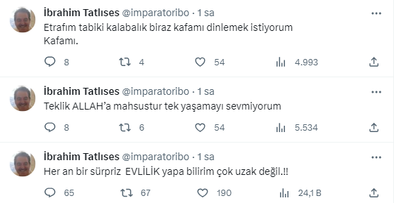 Ünlü türkücü İbrahim Tatlıses'ten sosyal medya hesabından "Evlilik yapabilirim çok uzak değil" dedi.Bir dönem özel hayatıyla gündemden düşmeyen İbrahim Tatlıses yeniden nikah masasına oturacağını duyurdu. Twitter hesabından...