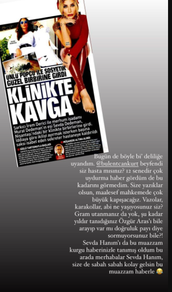 Derici, "Vazolar, karakollar abi ne yaşıyorsunuz siz? Gram utanmanız da yok, şu kadar yıldır tanıdığınız Özgür Aras'ı (basın danışmanı) bile arayıp var mı doğruluk payı diye sormuyorsunuz bile. Sevda Hanım'ı da bu muazzam kurgu haberinizle tanımış oldum bu arada merhabalar Sevda Hanım. Size de sabah sabah kolay gelsin bu muazzam haberle" dedi.