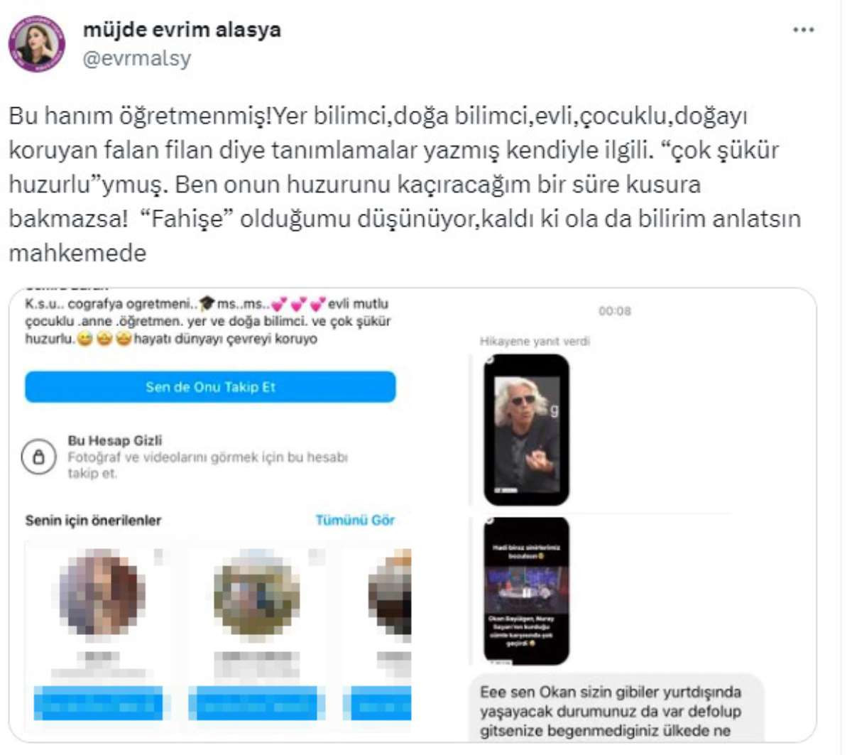 "Bu hanım öğretmenmiş! Yer bilimci, doğa bilimci, evli, çocuklu, doğayı koruyan falan filan diye tanımlamalar yazmış kendiyle ilgili. 'çok şükür huzurlu'ymuş. Ben onun huzurunu kaçıracağım bir süre kusura bakmazsa! 'Fahişe' olduğumu düşünüyor, kaldı ki ola da bilirim anlatsın mahkemede. Bakalım benimle ilgili derdi neymiş! Bu çirkin örnek üzerinden genelleme yapmak istemem ama bu ülkenin öğretmenleri bu haldeyse durum gerçekten vahim. Artık mahkemede anlatsın bakalım neden rahatsız olmuş benden! Ha bir de hayatı çevreyi koruyormuş."