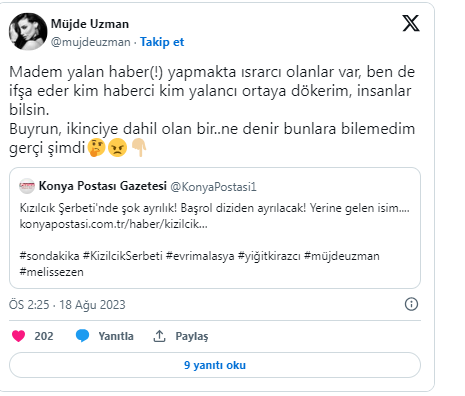 "Madem yalan haber yapmakta ısrarcı olanlar var, ben de ifşa eder kim haberci kim yalancı ortaya dökerim, insanlar bilsin. Buyurun, ikinciye dahil olan bir. Ne denir bunlara bilemedim gerçi şimdi"