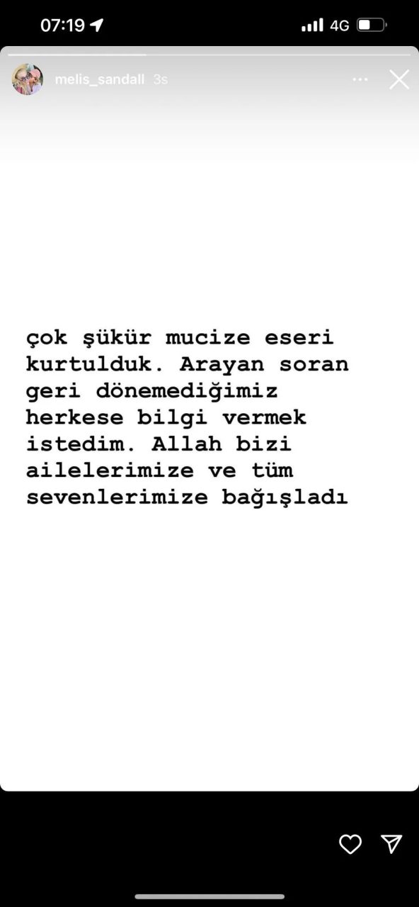 Sağlık durumunun iyi olduğu öğrenilen Melis Sandal, Instagram hesabından yaptığı açıklamada "Çok şükür mucize eseri kurtulduk. Arayan, soran geri dönemediğimiz herkese bilgi vermek istedim. Allah bizi ailelerimize ve tüm sevenlerimize bağışladı" ifadelerini kullandı.