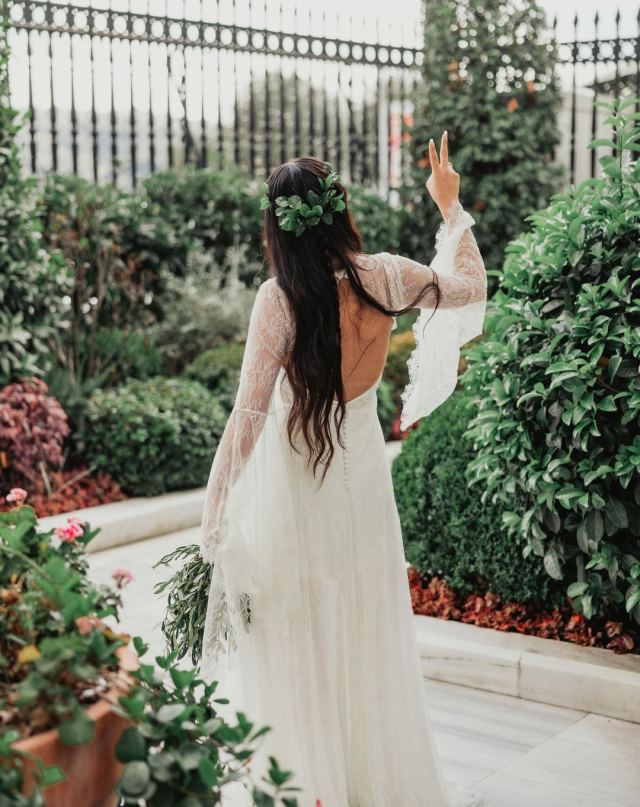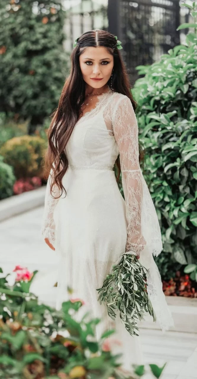 Ünlü oyuncu düğünde dantel işlemeli uzun kollu bir gelinlik tercih etti. Gelinlik tasarımcı Gamze Saraçoğlu imzası taşıyor.