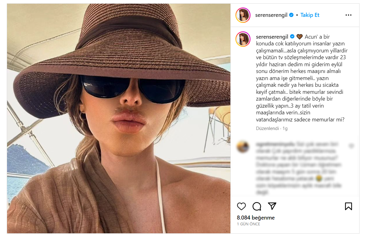 Sosyal medya paylaşımlarıyla sürekli gündeme gelen Seren Serengil, herkesin 3 ay tatil yapıp maaşını da alması gerektiğini söyledi. Serengil, Instagram hesabı üzerinden yaptığı paylaşımda şu ifadeleri kullandı:"Acun'a bir...