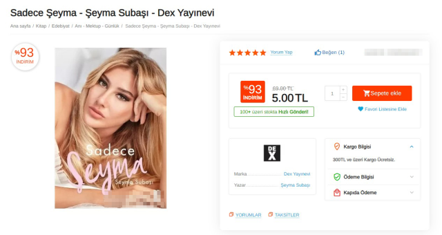Şeyma Subaşı'nın 2019 yılında kendi hayatından kesitlere yer vererek çıkardığı ''Sadece Şeyma'' kitabının fiyatı bir alışveriş sitesinde yüzde 93 indirimle 5 liraya kadar düştü.