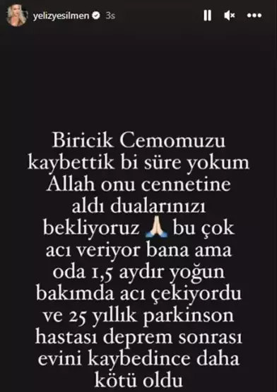 Acı haberi sosyal medya hesabından duyuran oyuncu "Biricik Cemomuzu kaybettik. Bir süre yokum. Allah onu cennetine aldı. Dualarınızı bekliyoruz. Bu çok acı veriyor bana ama oda 1.5 aydır yoğun bakımda acı çekiyordu. 25 yıllık Parkinson hastası, deprem sonrası evini kaybedince daha kötü oldu" mesajını paylaştı.