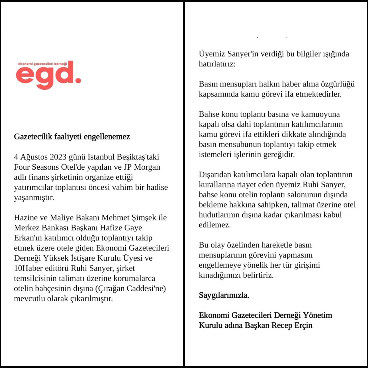 JP Morgan'ın İstanbul'da düzenlediği ve Hazine ve Maliye Bakanı Mehmet Şimşek ile TCMB Başkanı Hafize Gaye Erkan'ın katıldığı yatırımcı toplantısına 10 Haber editörü Ruhi Sanyer'in alınmaması üzerine Ekonomi Gazetecileri Derneği açıklama yaptı.