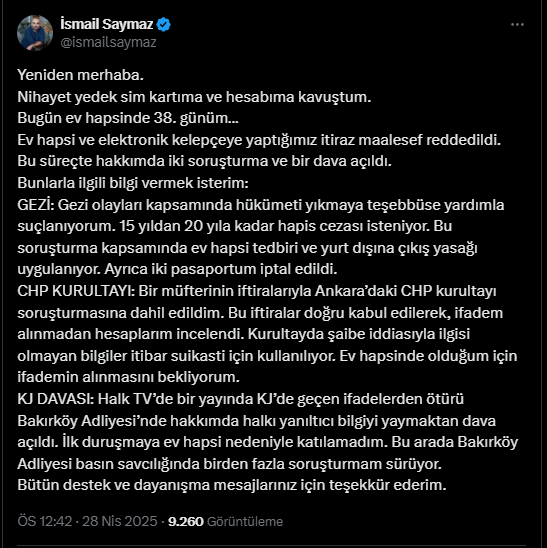 O günden bu yana elektronik kelepçeyle ev hapsinde olan Saymaz'ın, adli kontrol talebine itirazı da reddedildi. Saymaz, gözaltına alındığı günden sonraki ilk sosyal medya paylaşımında, bu süreçte hakkında başlatılan soruşturma ve açılan davaları özetledi.