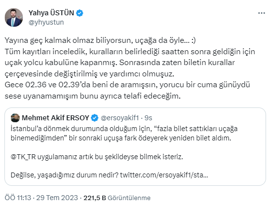 THY Basın Müşaviri Yahya Üstün sosyal medya hesabından Ersoy’a verdiği yanıtta, kayıtların incelendiğini ve Ersoy’un yolcu kabulünden sonra geldiği için uçağa alınamadığını sonrasında ise biletinin değiştirildiğini ve kendisine yardımcı olunduğunu belirtti.
