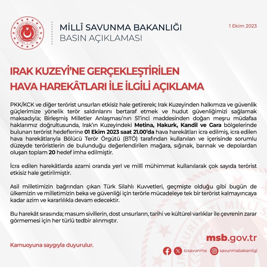 Savunma Bakanlığı yaptığı açıklamada "Irak'ın Kuzeyindeki Metina Hakurk, Kandil ve Gara bölgelerinde bulunan terörist hedeflerine 01 Ekim 2023 tarihinde saat 21.00'da hava harekatları icre edilmiş, icra edilen hava harekatlarıyla, Bölücü Terör Örgütü tarafından kullanılan ve içerisinde sorumlu düzeyde teröristlerin de bulunduğu değerlendirilen mağara, sığınak, barınak ve depolardan oluşan toplam 20 hedef imha edilmiştir" dedi.