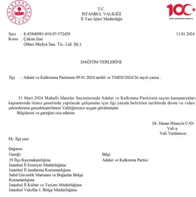İstanbul Valiliği tarafından çıkarılan izin yazısında AKP için çekim izni verilen şirketin Mars Medya Sanayi ve Ticaret Limited Şirketi olduğu belirtildi.