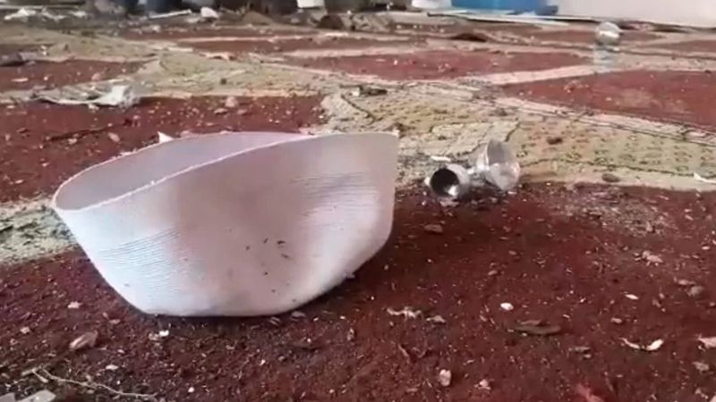 Sosyal medyada paylaşılan ve BBC tarafından doğrulanan bir videoda caminin bir duvarının yarısının yıkıldığı görülüyor. Videoda tuğla ve molozlarla kaplı camiden insanların kaçmaya çalışıyor.