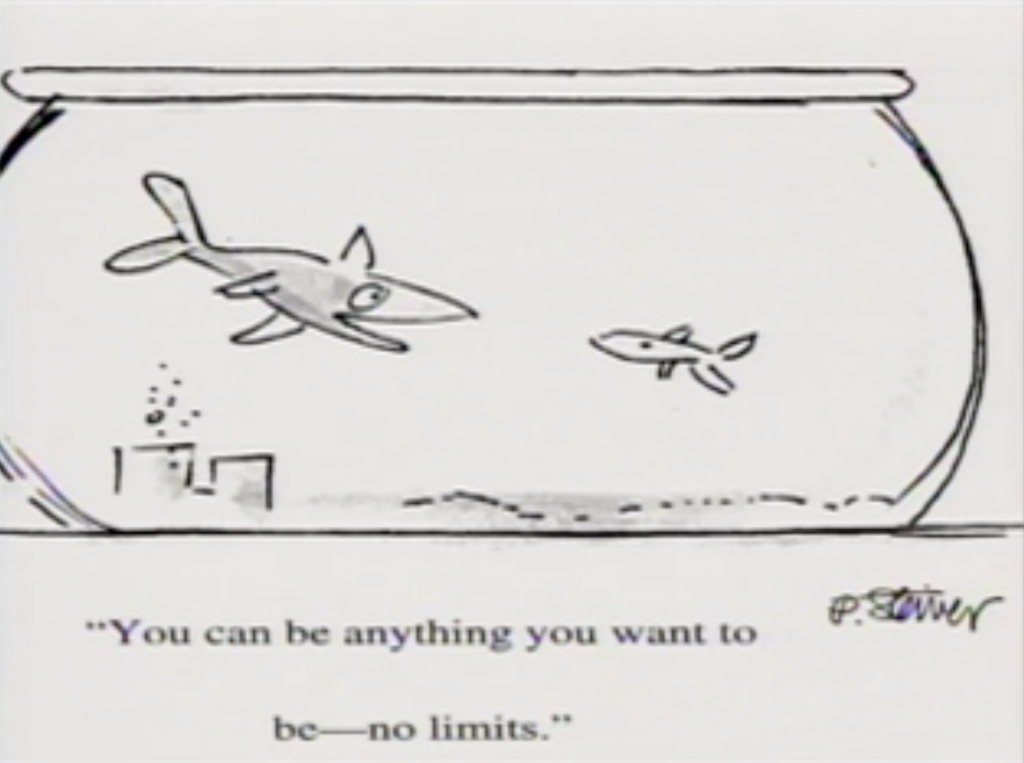 “İnsanların yaşantısına seçenekler katmak onlara yardım etmek yerine bu seçeneklerin ne kadar iyi olacağına dair beklentilerini yükseltir. Ve bu da daha az tatmin yaratır.” Schwartz’ın TedX sunumunda gösterdiği karikatürdeki balıklar gibiyiz. Okyanusun ortasındayız ancak içinde bulunduğumuz akvaryumun genişliği ile, seçeneklerimizin bolluğu ile övünüyoruz. O akvaryumu kırmayı hiç düşünmeden.