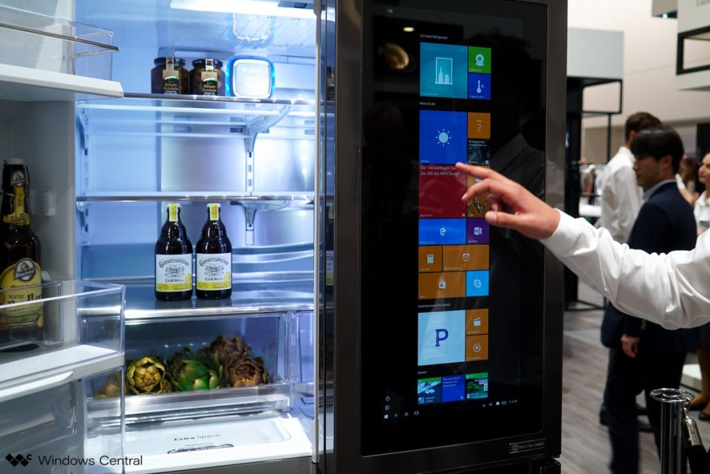 Resim altı: LG markasına ait instaview Thinq isimli buzdolabı Windows işletim sistemine bağlı. Dolabın içeriğini ekrana taşıyan ve si alışveriş listesi hazırlayan bu sistem ayrıca mobil cihazlardan kontrol edilerek, enerji tasarrufu için tatil moduna ayarlanabiliyor veya vereceğiniz parti için fazladan buz üretmek üzere komut alıyor.