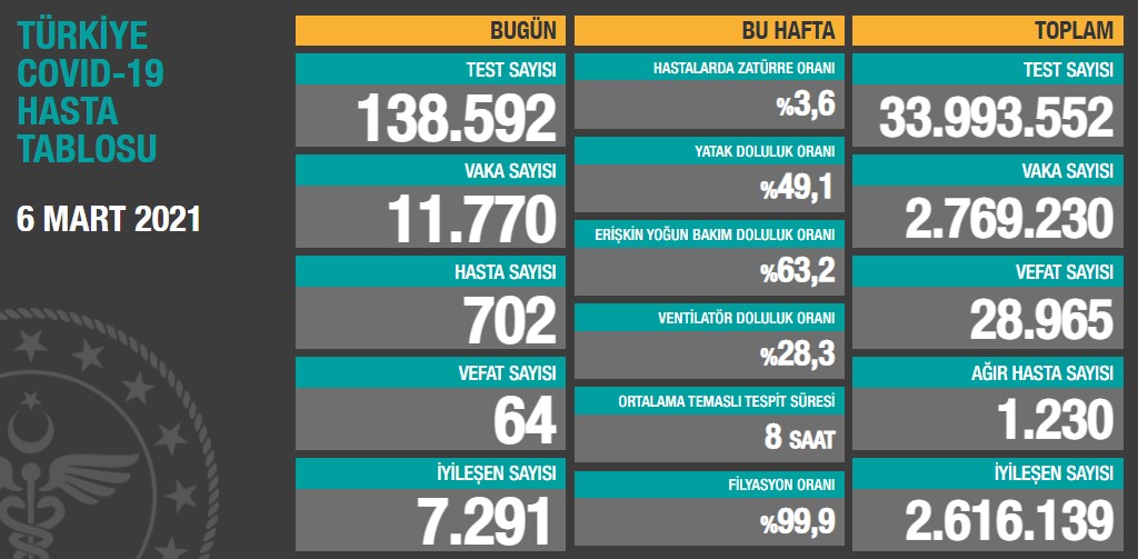 Sağlık Bakanlığı’nın son 24 saatlik verilerine göre, 702’si semptomatik olmak üzere toplam 11 bin 770 yeni vaka tespit edildi. Vefat sayısı ise 64 olarak kayıtlara geçti. Böylece Türkiye'de koronavirüs nedeniyle hayatını kaybedenlerin sayısı 28 bin 965'e, toplam vaka sayısı ise 2 milyon 769 bin 230'a yükseldi.