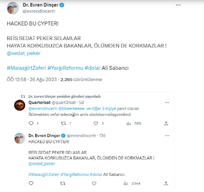 Aksaray Belediye Başkanı Dr. Evren Dinçer'in, X hesabı "hacklendi", Sedat Peker'e selam söylendi.