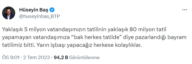 Sosyal medya hesabında bir mesaj yayımlayan Baş, "Yaklaşık 5 milyon vatandaşımızın tatilinin yaklaşık 80 milyon tatil yapamayan vatandaşımıza “bak herkes tatilde” diye pazarlandığı bayram tatilimiz bitti. Yarın işbaşı yapacağız herkese kolaylıklar" ifadelerini kullandı.
