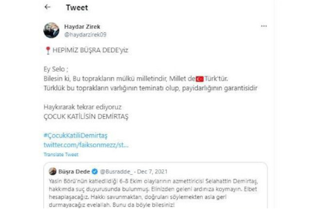 Medyascope'tan Ferit Aslan'ın haberine göre Aydın’da yaşayan Haydar Zirek, 7 Aralık 2021'de Twitter'dan yaptığı paylaşımda “Haykırarak tekrar ediyoruz, çocuk katilisin Demirtaş” diye yazdı. Bunun üzerine Demirtaş’ın avukatları, Zirek hakkında Aydın Cumhuriyet Başsavcılığı’na suç duyurusunda bulundu.
