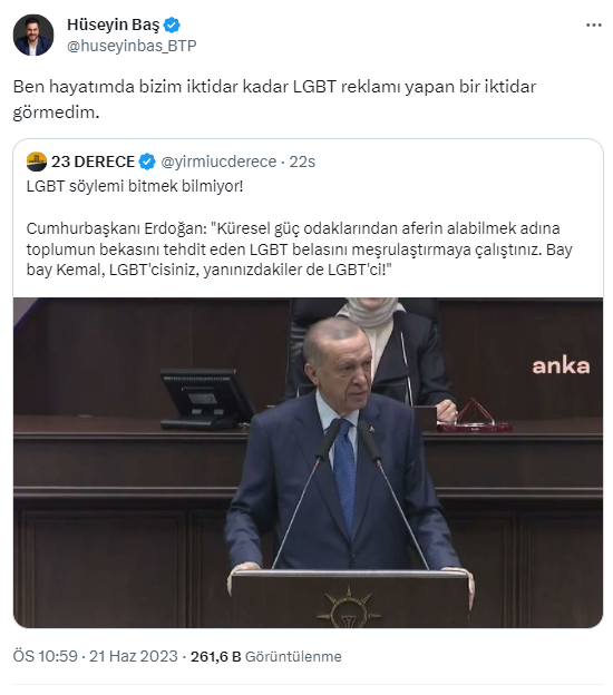 Cumhurbaşkanı ve AKP Genel Başkanı Recep Tayyip Erdoğan'ın, "Küresel güç odaklarından aferin alabilmek adına toplumun bekasını tehdit eden LGBT belasını meşrulaştırmaya çalıştınız. Bay bay Kemal, LGBT'cisiniz, yanınızdakiler de LGBT'ci!" açıklamasını alıntılayan Baş, "Bizim iktidar kadar LGBT reklamı yapan bir iktidar hayatımda görmedim" ifadesini kullandı.