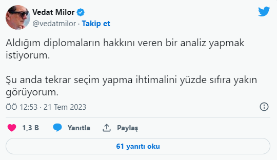 Twitter'dan paylaşım yapan Milor "Aldığım diplomaların hakkını veren bir analiz yapmak istiyorum. Şu anda tekrar seçim yapma ihtimalini yüzde sıfıra yakın görüyorum." dedi.