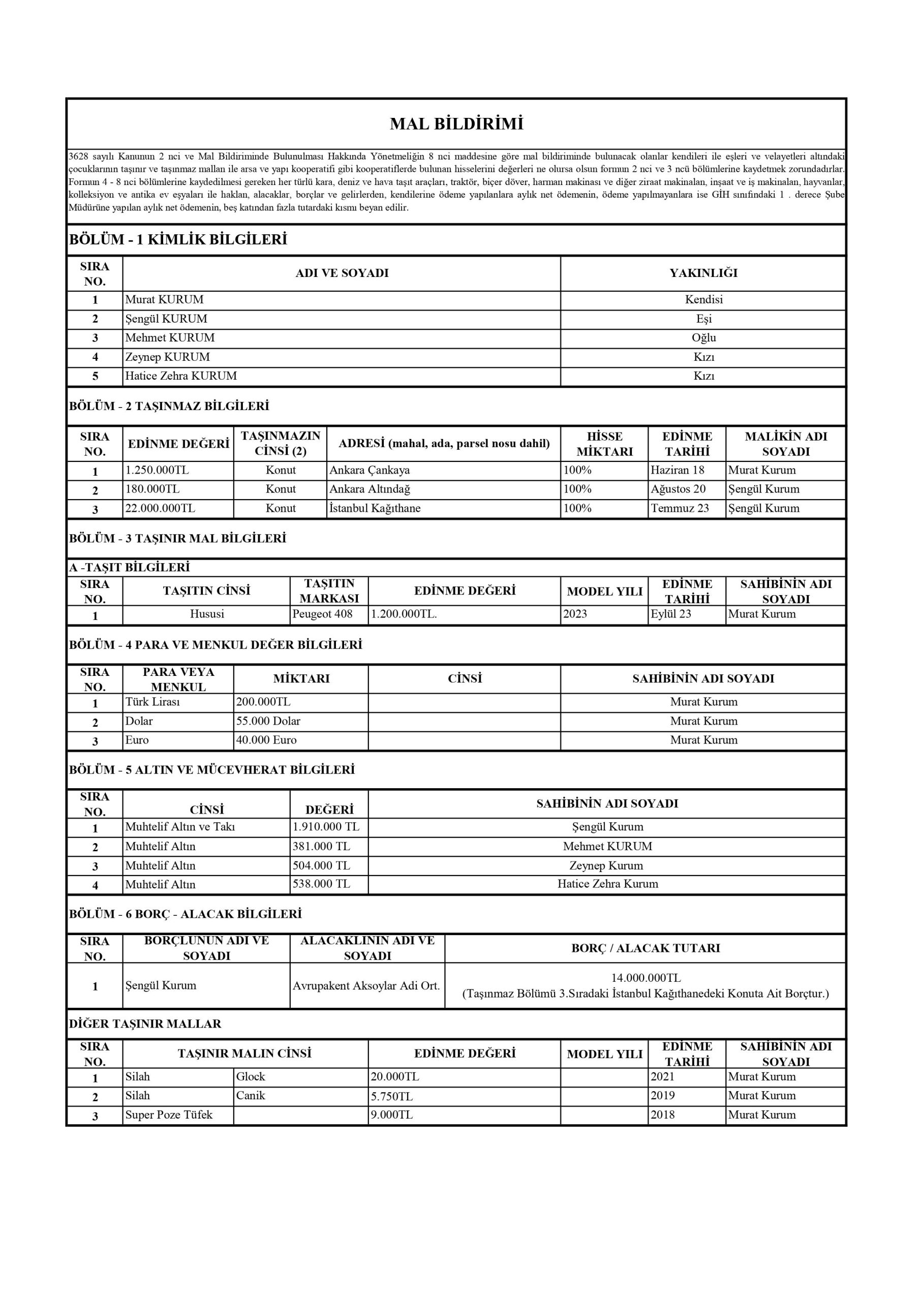Kurum tarafından paylaşılan mal beyanında İstanbul'da değil Ankara'da 2 evi olduğu ortaya çıktı. Kurum'un İstanbul'da 22 Milyon Lira değerinde bir evi var.