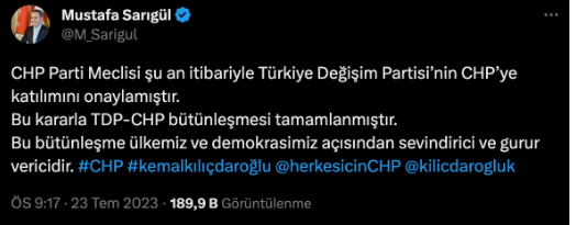 Sarıgül, “CHP Parti Meclisi şu an itibariyle Türkiye Değişim Partisi’nin CHP’ye katılımını onaylamıştır. Bu kararla TDP-CHP bütünleşmesi tamamlanmıştır. Bu bütünleşme ülkemiz ve demokrasimiz açısından sevindirici ve gurur vericidir” yazdı.