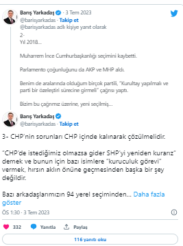 Yarkadaş, şunları söyledi: "Bazı arkadaşlarımızın 94 yerel seçiminden hiçbir ders almadıkları ve “aynı şeyi yaparak farklı sonuçlar almaya çalışmaları” gerçekten ilginç.. “SHP’yi kuracağım” diye zemin yoklayan ve görev alan arkadaşımız da böyle tarihsel bir vebalin altına girmemelidir. 2024 yerel seçimlerini “birlik içinde” kazanmak zorundayız."