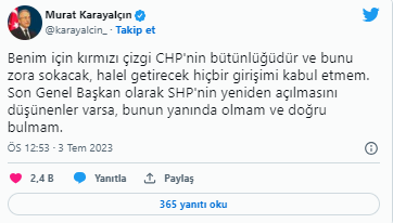 Twitter hesabınan açıklama yapan Karayalçın, "Benim için kırmızı çizgi CHP'nin bütünlüğüdür ve bunu zora sokacak, halel getirecek hiçbir girişimi kabul etmem" dedi.