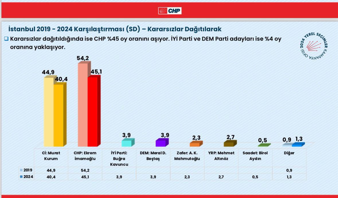 CHP’nin yaptırdığı iddia edilen anketin sonuçlarına göre, CHP adayı Ekrem İmamoğlu yüzden 45.1’le ilk sırada yer alıyor. Cumhur İttifakı (AKP-MHP) adayı Murat Kurum da, yüzde 40.4’le ikinci sırada. DEM Parti adayları Meral Danış Beştaş ile Murat Çepni ve İYİ Parti adayı Buğra Kavuncu yüzde 3.9 oy alırken, Yeniden Refah Partisi’nin adayı Mehmet Altınöz yüzde 2.7 oy oranına sahip görünüyor.