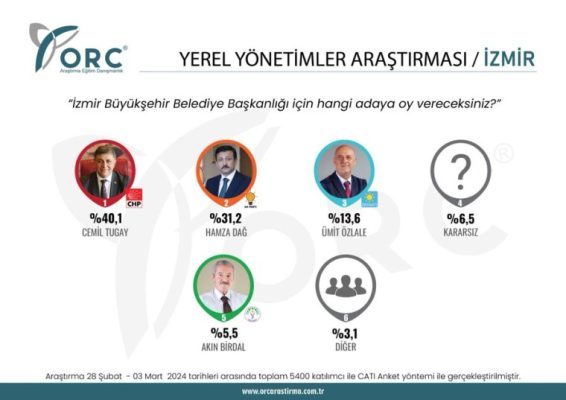Seçime günler kala araştırma şirketlerinin anket çalışmaları yakından takip ediliyor. ORC Araştırma, İzmir yerel seçimlerine ilişkin anket yaptı. Şirketin İzmir için gerçekleştirdiği yerel seçim anketinde CHP'nin İzmir adayı Cemil Tugay ile AKP'nin adayı Hamza Dağ yarıştı.