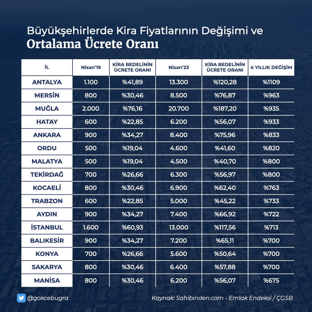 Büyükşehirlerde manzara Türkiye ortalamasından çok daha farklı. Nisan 2019 - 2023 döneminde 30 büyükşehirde kira bedelinde ortalama artış oranı yüzde 697. Antalya'da artış yüzde 1.109, Mersin'de yüzde 963, Muğla'da yüzde 935, Ankara'da yüzde 833, İstanbul'da yüzde 713.