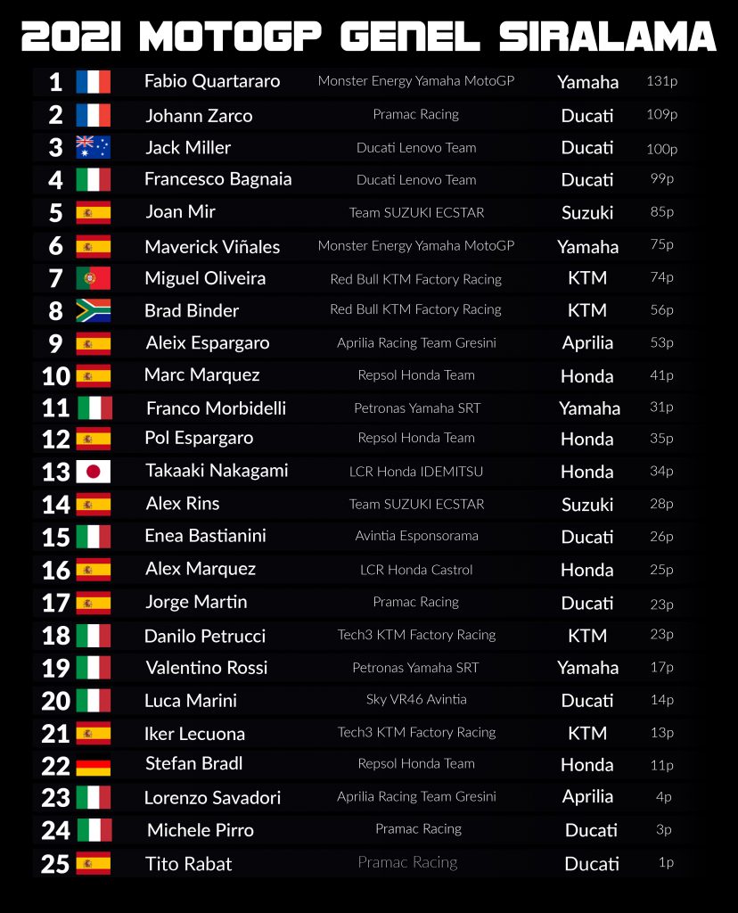 Şampiyona lideri Quartararo yarışa ikinci sıradan başladı. Fransız pilot ilk turlarda gerilere düşse de, bitime son on tur kala iyi bir performans gösterdi ve podyumun son basamağını aldı.