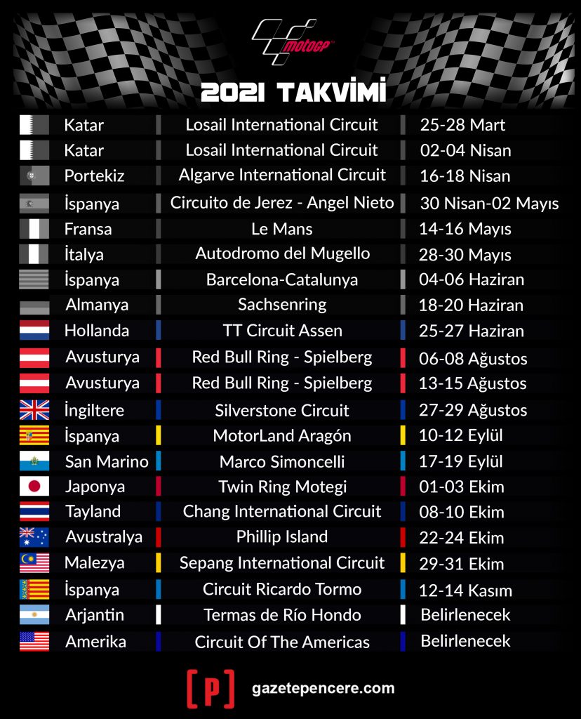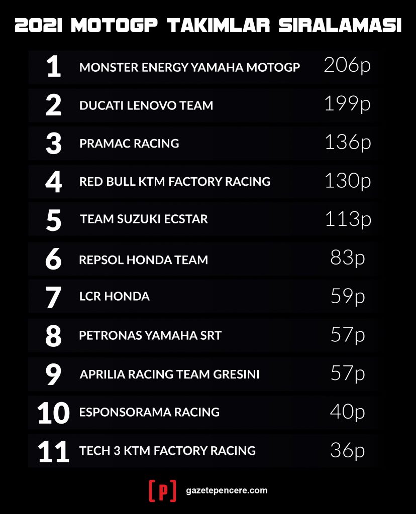 Beşinci cepten yarışa başlayan Marquez kırmızı ışıkların sönmesiyle müthiş bir çıkış yaptı ve ilk virajdan sonra ikinciliği aldı. Bir tur boyunca Aleix Espargaro’nun arkasında kalsa da start düzlüğünde liderliği aldı ve yarışı birinci sırada bitirdi. Bu seneki ilk podyumunu birincilikle alan İspanyol pilot, 2019 Kasım Valencia galibiyetinden sonraki ilk galibiyetini de elde etmiş oldu. Bu pistte katıldığı tüm serilerde birinci olan Marquez bu sonuçla galibiyet serisini 11’e çıkardı. Marquez’in geri dönüşü mü? Bunu önümüzdeki yarışlar gösterecek.