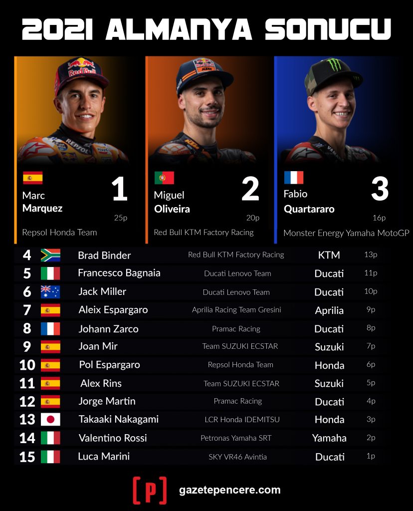 2021 MotoGP sezonunun sekizinci yarışının yapıldığı Almanya Grand Prix’sini Honda sürücüsü Marc Marquez kazanırken, ikinci son yarışın galibi KTM pilotu Miguel Oliveira, üçüncü şampiyona lideri Fabio Quartararo oldu.